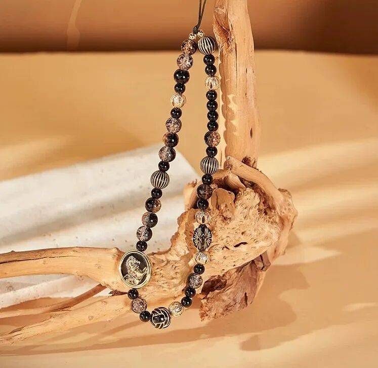 以黑金配色营造高级神秘感,琉璃与树脂珠折射光影,金色镂空珠增添轻奢层次。点缀其间的飞马元素, 寓意马不停蹄地向前进发,为日常穿搭注入个性与神话色彩。
